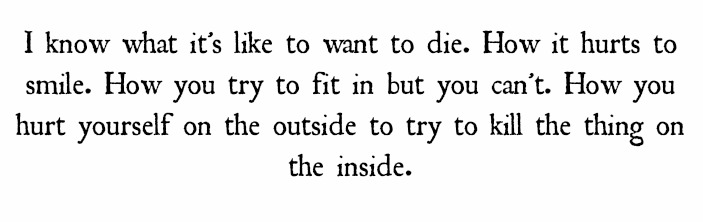 But I'm not fine. I cut myself. I've made myself throw up before. I've skipped meals. I've attempted suicide. I let my thoughts consume until my mind is in a dark and cloudy haze of depression. I hate looking in the mirror. I hate looking at pictures. I hate that people are fooled by my smiles. I hate it so much. I hate faking it. I hate pretending to be someone I'm not. I hate that I always have to wear long sleeves and jackets. I hate that I'm too insecure to wear shorts. I hate it. I hate myself.